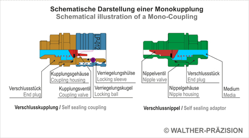 Eine Monokupplung besteht aus zwei Verbindungselementen, der Kupplung und dem Nippel. Häufig werden die beiden Teile aufgrund ihres Steckprinzips auch als “weiblich und männlich”, “Mutter- und Vaterteil” oder “Fassung und Stecker ” bezeichnet.